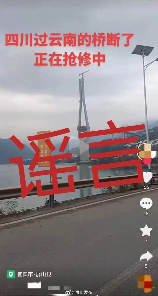 屏山发布消息 2月5日,一网民在网络平台发布视频,称“四川过云南的桥断了,正在抢修中”,引起关注。