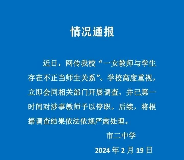 近日,网传我校“一女教师与学生存在不正当师生关系”。学校高度重视,立即会同相关部门开展调查,并已第一时间对涉事教师予以停职。后续,将根据调查结果依法依规严肃处理。