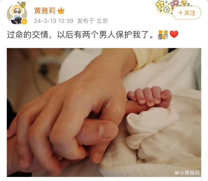 3月13日,歌手黄雅莉在个人社交媒体上官宣生子。