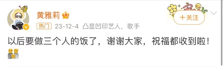 2023年12月4日,她在微博官宣了怀孕的消息。