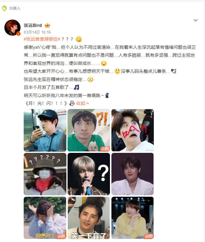 随后,针对被传患躁郁症的消息,张远晒出多张自己的表情包,发文回应营销号并配上了三个问号,写道:“个人认为不用过度渲染,在我看来人生浮沉起落有情绪问题也很正常,所以我一直觉得就算有点问题也不是问题......”“张远先生现在精神状态很稳定。”