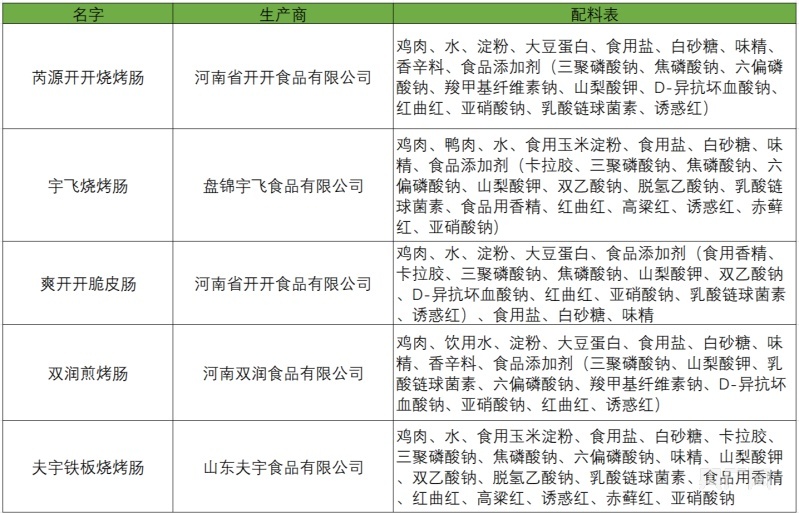记者购买了目前市场上销售量较高的五种品牌淀粉肠,综合观察配料表发现,淀粉肠的配料表差别不大,基本上都是由肉,水,淀粉,白砂糖、味精、香辛料等调味料以及三聚磷酸钠、焦磷酸钠、六偏磷酸钠、羧甲基纤维素钠、诱惑红等添加剂共计十五六种成分组成。