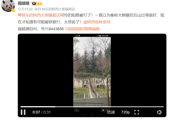 近日有多位网友发视频爆料称,秦岭四宝科学公园的大熊猫“知路”被工作人员用铁锨戳打,非常心疼,并且@了陕西省林业局。