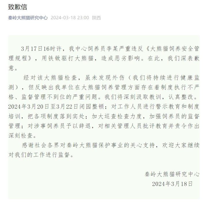 3月18日晚,秦岭大熊猫研究中心发布致歉信称,3月17日16时许,该中心饲养员李某严重违反《大熊猫饲养安全管理规程》,用铁锨驱打大熊猫,造成恶劣影响。在此,秦岭大熊猫研究中心深表歉意。