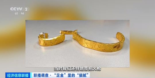 消费者 李女士:买的时候是28000多元。当时我们还特地带把火枪,想着不变色就是真的,当场烧红了,没有变色,我还特地买了小秤去称,克数、重量都一样。他还给了假冒的周大福袋子,还弄了发票。结果拿过去一鉴定,剪开来里面全部是银,然后才去报警。