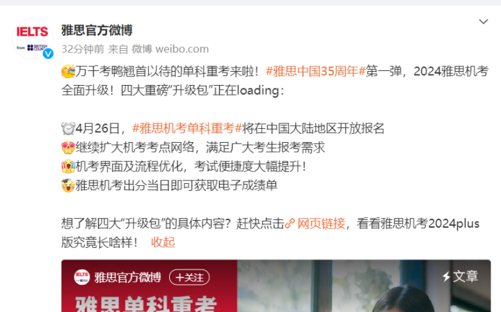 今天,@雅思官方微博宣布:自2024年4月1日起,考生在中国内地参加过一次全科雅思机考并收到成绩单后,自考试日(即原成绩单上注明的考试日期)起60天内可注册并参加一次单科重考。雅思单科重考报名系统将于4月26日起开放,首场考试将于5月6日进行。
