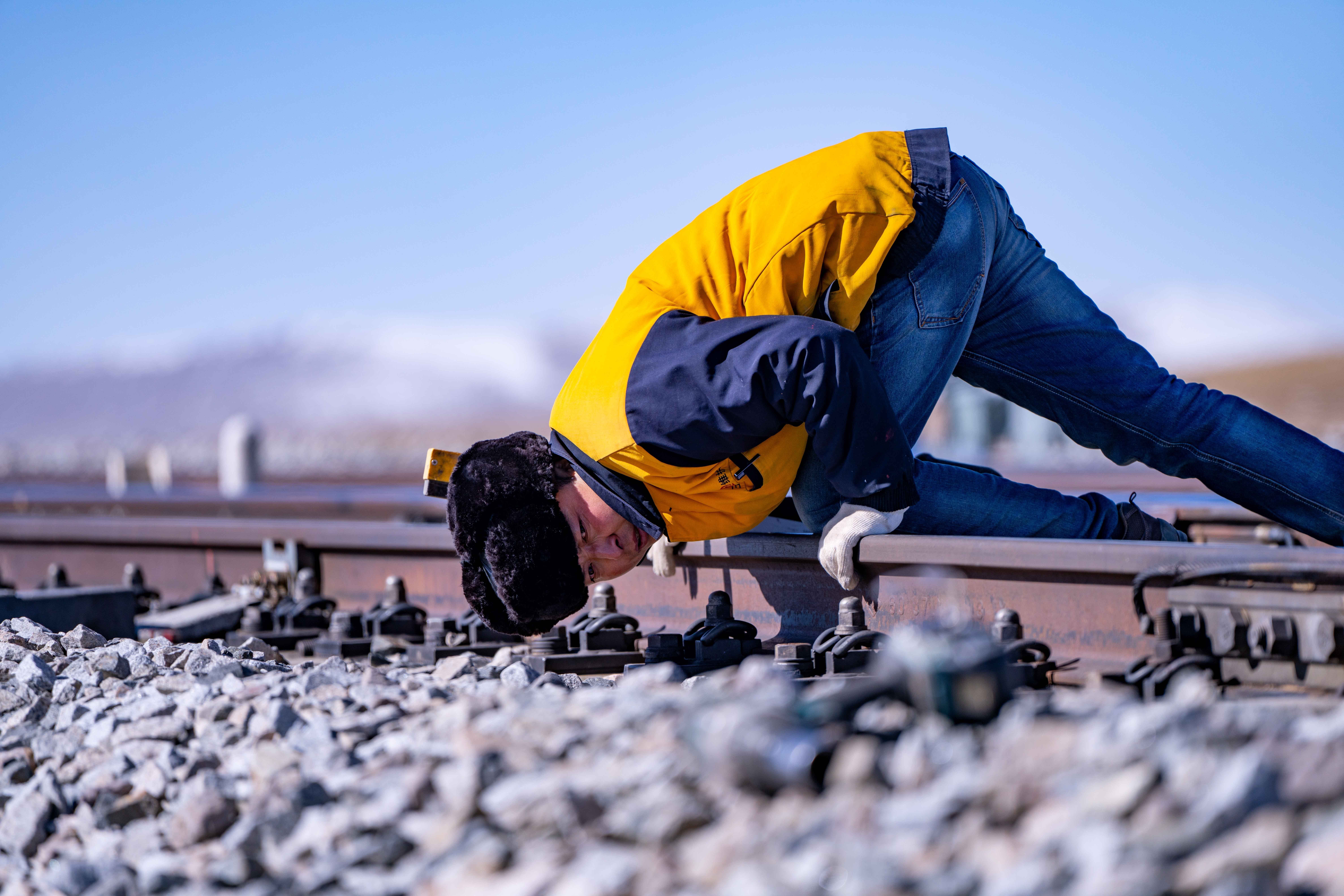 在唐古拉山,天窗无论早晚——从满天星斗到晨光熹微,只要是需要施工的时候,马祎俊都会带着工人们奋战在铁轨之上。“为了让铁路更加平稳,我们多辛苦都值得。”他说。