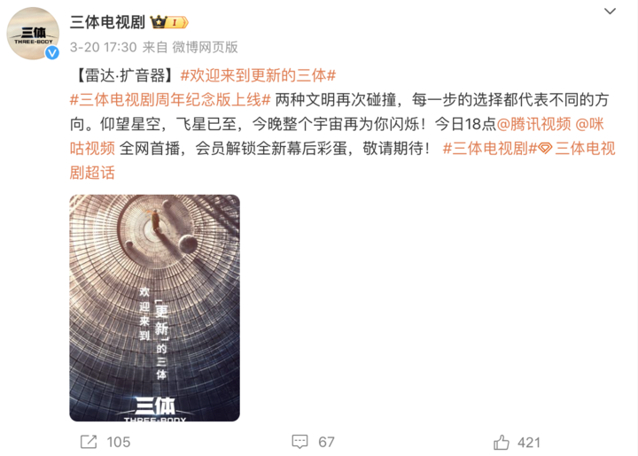 或许国产《三体》的叙事和内核更适合中国人观看,之前虽然被诟病啰嗦,但是现在腾讯出了一个周年纪念版,导演杨磊将原30集版本缩减到了26集,于3月20日上线,