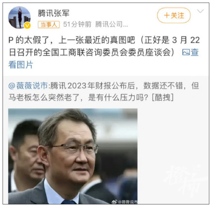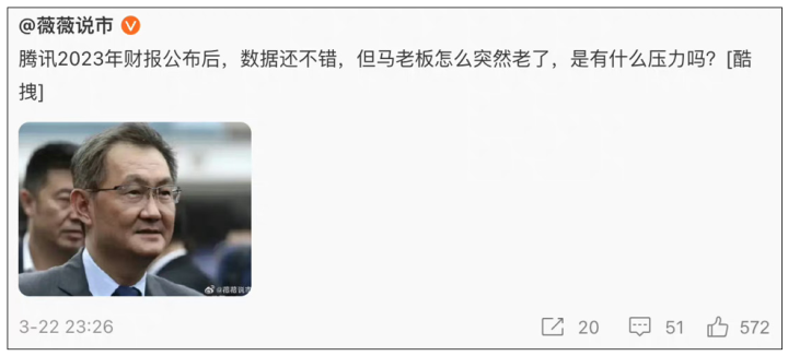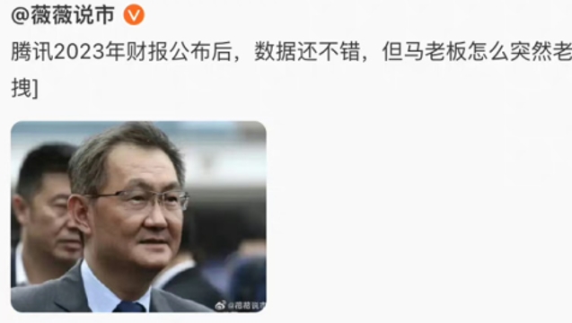 都市快报讯 近日,微博账号@薇薇说市 发文称:“腾讯2023年财报公布后,数据还不错,但马老板怎么突然老了,是有什么压力吗?”