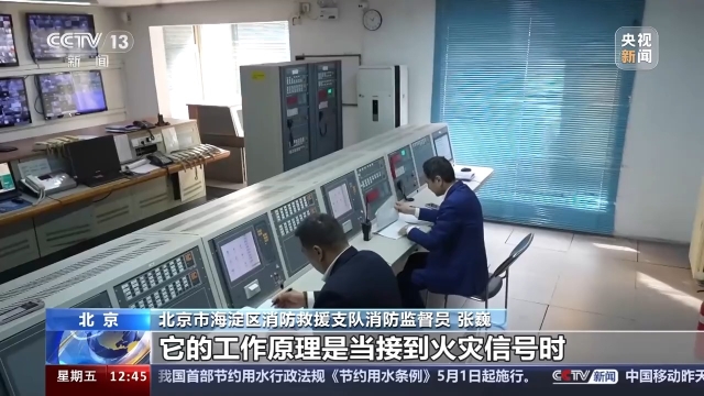 北京市海淀区消防救援支队消防监督员 张巍:在咱们这个消防控制室内部,主要设备是联动性火灾报警控制器,也就是我们常说的消防主机。它的工作原理是当接到火灾信号时,一方面启动现场的声光报警,提示人员紧急疏散撤离,另一方面也会发出联动的控制信号,启动现场的消防设备。最终达到早期预警,通知人员疏散,扑灭火灾和防止火灾蔓延的作用。