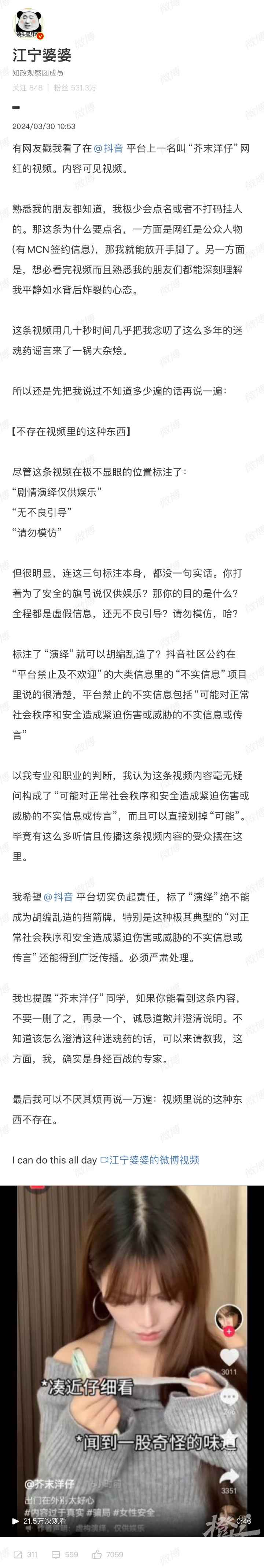 3月30日上午,有着500多万粉丝的知名网红民警、南京江宁区警察“江宁婆婆”发文,在某视频平台看到上一名叫“芥末洋仔”网红的视频,“这条视频用几十秒时间几乎把我念叨了这么多年的迷魂药谣言来了一锅大杂烩。”