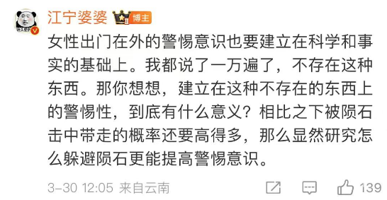 对此,“江宁婆婆”回复表示,女性出门在外的警惕意识也要建立在科学和事实的基础上。我都说了一万遍了,不存在这种东西。那你想想,建立在这种不存在的东西上的警惕性,到底有什么意义?相比之下被陨石击中带走的概率还要高得多,那么显然研究怎么躲避陨石更能提高警惕意识。