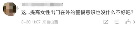 值得一提的是,在这条微博下方,有不少网友留言表示,提高女性出门在外的警惕意识也没什么不好吧?