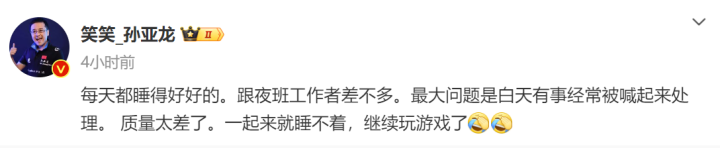 对此孙亚龙也更新微博澄清:酒本来就不喝, 烟也戒了,龙咳都没了,最大问题是睡眠质量太差。