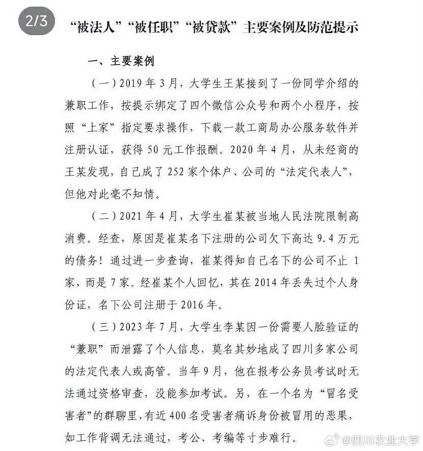 日前,四川某高校向学生发放《关于大学生“被法人”等诈骗现象的安全警示》,要求同学们以近期发生的多起大学生被冒名注册导致“被法人”的案件为例,强化安全理念、增强防范意识。