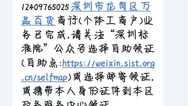 李璐星还收到一条来自深圳政务短信平台发送的短信,信息中写道,“深圳市龙岗区万品百货商行(个体工商户)业务已完成”。此外,她还收到深圳市市场监督管理局、人力资源和社会保障局发来的提示短信。