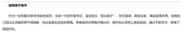 在忏悔书中,褚锦锋还写道:“我被‘政治骗子’欺骗是自投罗网、咎由自取。出现这些问题的根本原因是我忘记了共产党人的初心使命,是我把公权力变成为自己谋名利、为个人谋升迁的工具。特别是升任韩城市委书记后,本身已处巅峰,还想跃起摘星,结果跌个乌青。初心变质,理想变味,难免坠入深渊。”