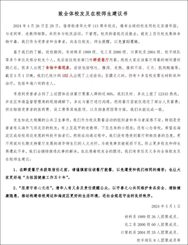 近日,社交平台上一份《致全体校友及在校师生建议书》引发网友关注。建议书中称,4月26日至28日,清华大学113周年校庆,多地校友参与校庆活动。返校期间,多个单位及部分校友个人,先后前往校东南门外某餐厅用餐,后续上百位校友出现食物中毒现象。