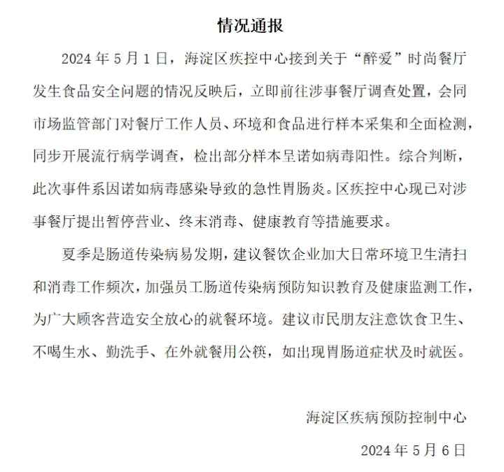 5月6日晚,“海淀疾控”通报“醉爱”时尚餐厅食品安全问题,综合判断系诺如病毒导致。