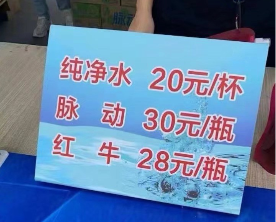 一杯纯净水卖20元,一瓶脉动卖30元