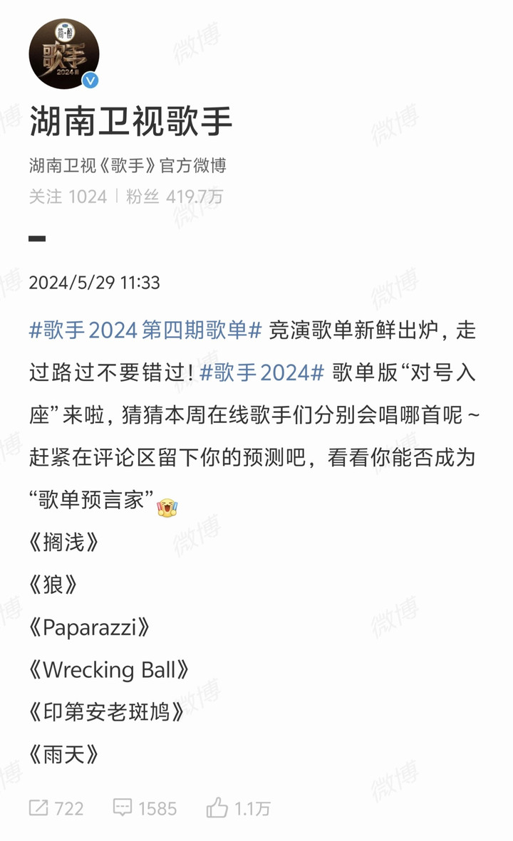 29日中午,《歌手2024》的歌单也已经正式公布,或许是因为周末周杰伦要在长沙开演唱会,六首竞演歌曲,《搁浅》《印第安老斑鸠》这两首都是周杰伦的歌。