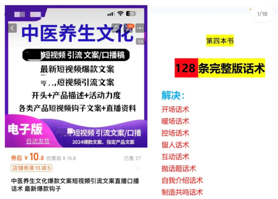 记者在某网购平台上检索发现,有商家售卖“大健康爆款文案短视频引流文案”,价格8元至29元不等。其中包含100多种健康类网络直播话术,包括互动话术、抛话题话术、制造共鸣话术等。