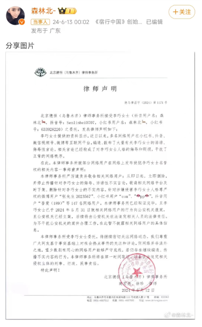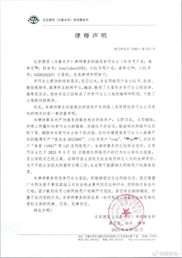 本律师事务所严厉谴责并敬告相关网络用户:从即日起,立即删除,并停止传播针对李巧女士的侮辱、诽谤性不实言论,敬请相关网络平台及时下架、删除针对李巧女士的不实内容。针对涉嫌侵害李巧女士人格尊严权的微博用户“张先生2023567”、小红书用户“com”、“一pp◆”,抖音用户“吾爱(189)”等147名网络用户,本律师事务所已经取证完毕,且李巧女士已于2024年5月31日就相关网络用户的行为向公安机关报案,且公安机关已经立案,后续将由公安机关依法追究相关人员的法律责任。为不干扰公安机关的案件办理工作,在此暂不披露相关网络用户的具体信息。