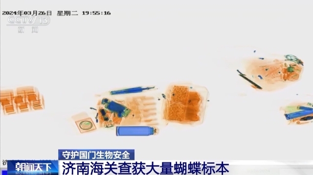 济南机场海关旅检二科科长 陈重:根据相关信息,我们对日本大阪入境航班进行风险分析,发现一名旅客存在重大走私嫌疑,现场对他进行X光机过机检查,发现其图像存在明显异常。现场对他进行拦截后,通过开箱查验,发现其携带蝴蝶标本近800只、蜻蜓标本3只。