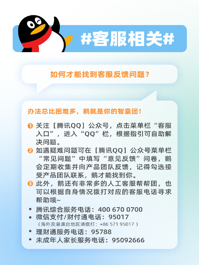 2.如遇疑难问题可在[腾讯QQ] 公众号菜单栏“常见问题”中填写“意见反馈”问卷,鹅会定期收集并向产品团队反馈,记得勾选接受产品团队联系,鹅才能找到你。