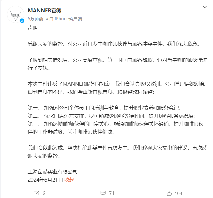 6月21日晚间,@MANNER咖啡 官微发文称,对公司近日发生咖啡师伙伴与顾客冲突事件,深表歉意。