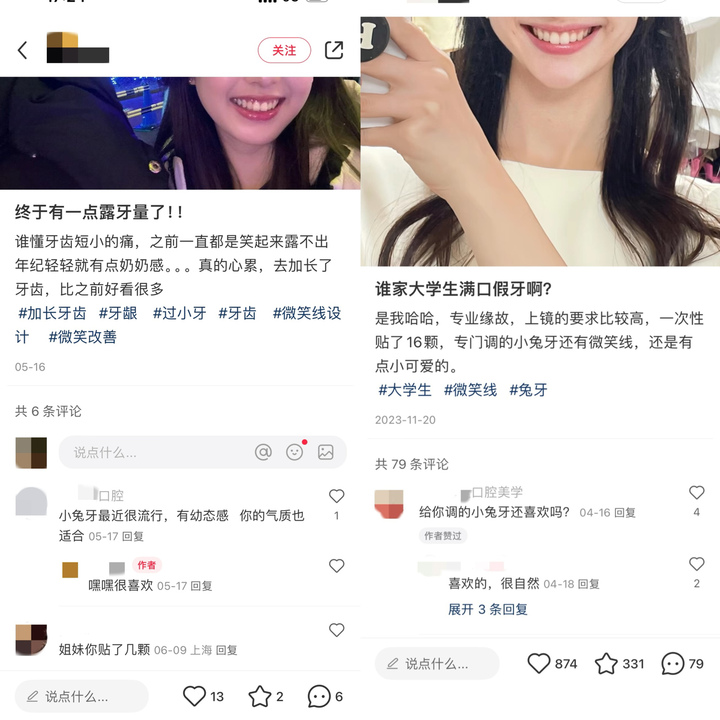 记者在某社交平台上搜索“宝宝牙”“兔牙”相关内容时发现,不少网友分享过自己的整牙经历,但其中大部分为引流帖。基本套路为网友发出自己整牙后的自拍照,配文如“加长了牙齿,比之前好看很多”,评论区往往会出现某口腔诊所账号,回复“小兔牙最近很流行,有幼态感,你的气质也适合”,以较为隐蔽的方式吸引其他人去咨询、调整牙齿。
