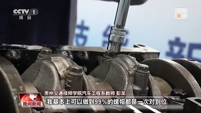 贵州交通技师学院汽车工程系教师 彭龙:在比赛过程中看似很简单的紧固螺栓的动作,其实是经过多次的训练。如果套筒和螺帽不能够一次性到位,那么每一个螺帽耽搁1—2秒的时间,发动机100多颗螺栓里面就会多出一分多钟的时间。我基本上可以做到99%的螺帽都是一次对到位。
