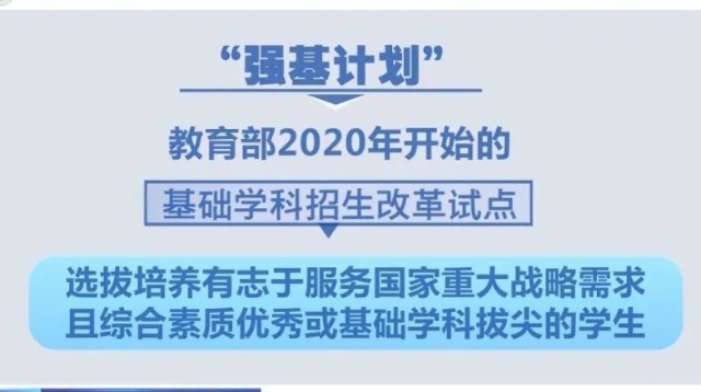 “强基计划”是教育部2020年开始的基础学科招生改革试点,选拔培养有志于服务国家重大战略需求且综合素质优秀或基础学科拔尖的学生。目前在全国39所高校试点,在数学、物理、化学、生物、力学、历史、哲学、古文字学、基础医学等基础学科以及核技术、生物育种等国家重大战略领域相关专业招生。