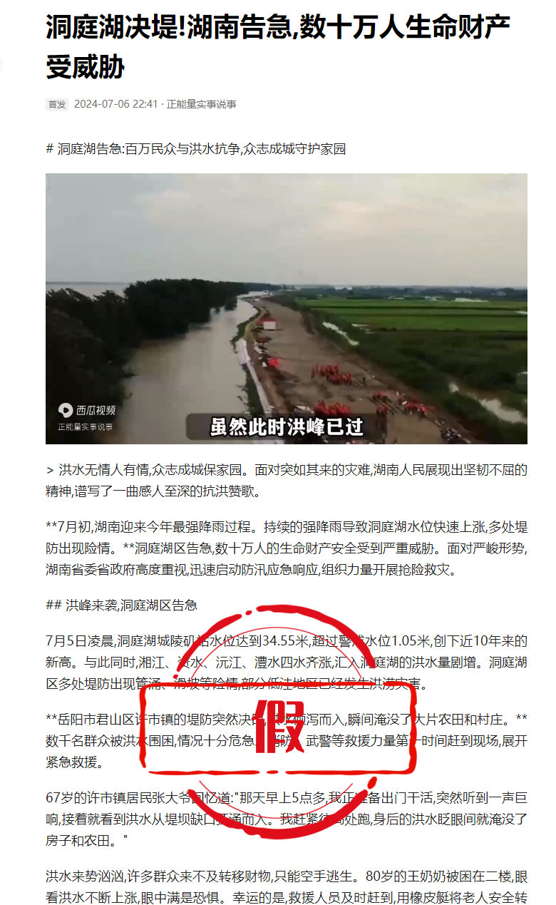 7月6日晚,有自媒体以《洞庭湖决堤!湖南告急,数十万人生命财产受威胁》为标题发文称,“湖南省岳阳市君山区许市镇的堤防突然决口,洪水倾泻而入,瞬间淹没了大片农田和村庄。数千名群众被洪水围困,情况十分危急。消防、武警等救援力量第一时间赶到现场,展开紧急救援。”