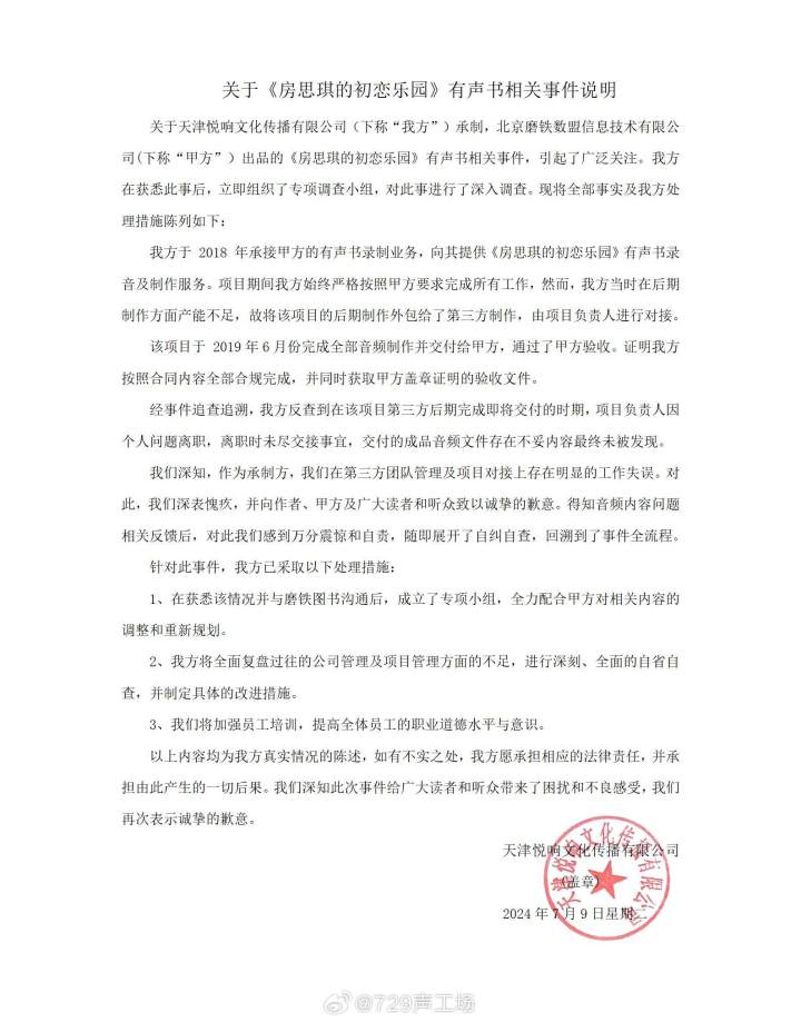 7月9日晚,制作方天津悦响文化传播有限公司旗下“729声工场”声明道歉,称该项目的后期制作由第三方完成,由项目负责人对接,但该负责人已经离职,并未交接事宜,导致成品文件中的不妥内容未被发现。