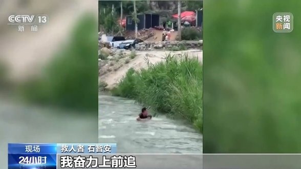 救人者 石智安:当时有点发蒙,我也顾不上怎么着了,先救这个小孩,然后顺着河流漂到这个位置,我奋力上前追,漂到20米左右,漂到那个芦苇那一块,我抓住那个小孩的腿、腰,然后把他给救上来了。