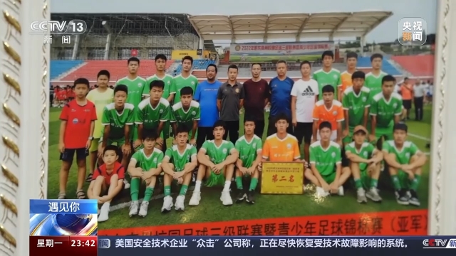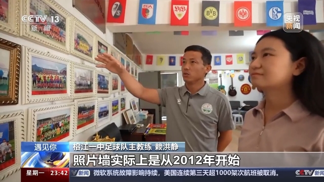 榕江一中足球队主教练 赖洪静:照片墙实际上是从2012年开始,我们参加校园足球赛取得的一些荣誉,以及每一批队员的全家福,都安排在里面。从2012年照片还有点模糊到越来越高清。这张照片里有接近10名球员在这次“村超”的决赛,包括我们所熟悉的陆金福、吴佳杭、吴文浪。