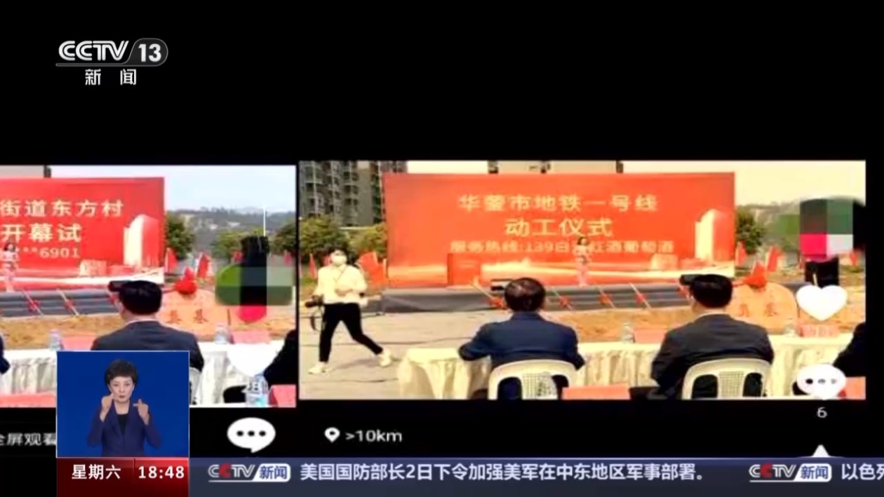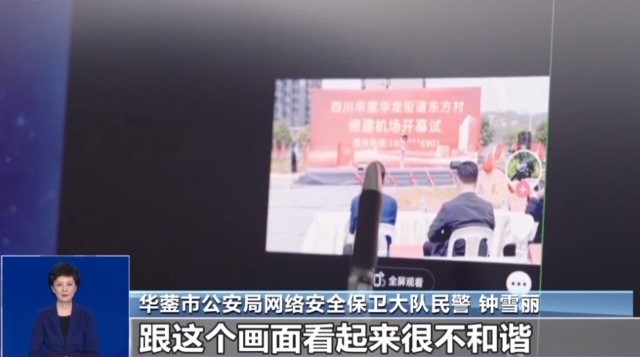 华蓥市公安局网络安全保卫大队民警 钟雪丽:这个视频还是有些漏洞,看起来不真实,你们看这个视频里面坐在前面的这些人,还有上面的主持人都是假的,跟这个画面看起来很不和谐;另外这个开幕“试”也是错别字。我们发现这两条视频之后,第一时间就找城建部门查实,城建部门也给了我们回复,证实我们本地没有这两个项目。