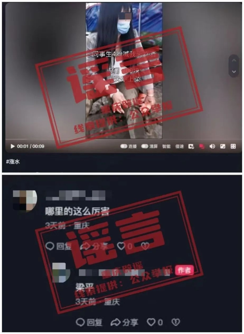 近日,网民黎某发布了一段涨洪水的视频,配文“同事生4胎喊我来吃酒,随了200块半天不上菜”,并在评论区称事发地在重庆梁平,引发关注。经核实,黎某发布的视频及文字均为捏造的谣言信息。