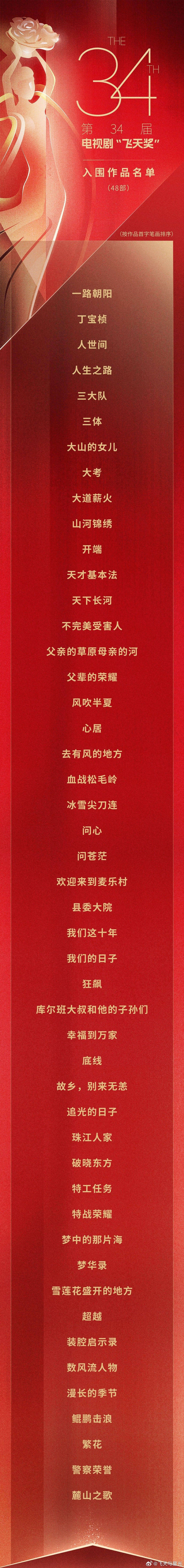 第34届“飞天奖”的评选范围为2022年1月1日至2023年12月31日期间,在中央电视台或各地卫视频道播出的电视剧,在全国性重点视频网站首播的电视剧和网络剧。这也是“飞天奖”首次将网络剧纳入评选范围。