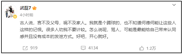 今天,武磊在社交平台上回应球迷的辱骂:“古人说,言不及父母,祸不及家人。我就是个踢球的,也不知道何德何能让这些人这样的记恨。很多人劝我不要计较。怎么说呢,骂人,可能是最能给自己带来认同感并且没有成本的发泄方式。好吧,开心就好。 ”