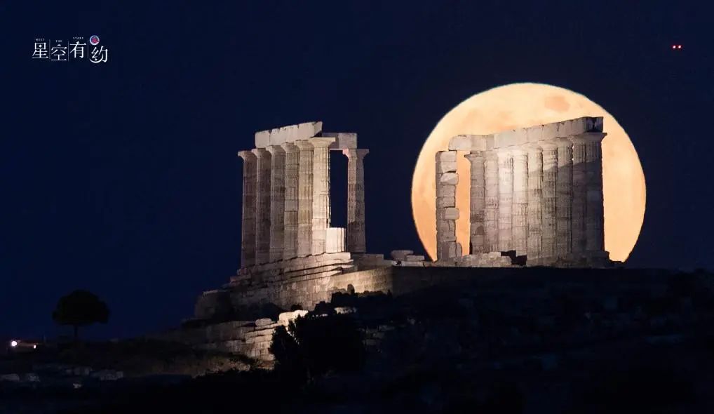 这是2021年5月26日在希腊苏尼翁的海神庙遗址拍摄的年度最大满月。新华社发(马里奥斯·罗洛斯摄)