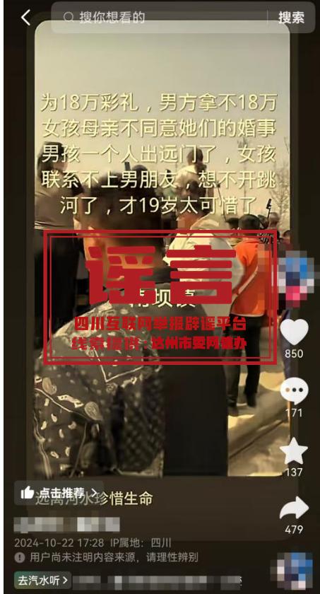 四川互联网举报辟谣平台消息 10月22日,网上出现群众聚集围观视频,并配文称,南坝镇一女孩因男方拿不出18万彩礼,女方家人不同意其婚事,男方一个人出远门,女孩无法联系男友而跳河。宣汉县委网信办第一时间组织宣汉县公安局和南坝镇政府调查核实,经核查,该信息为谣言,请广大网民不信谣、不传谣。