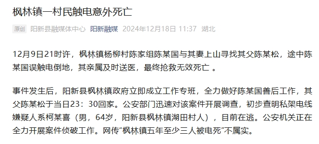 事件发生后,阳新县枫林镇政府立即成立工作专班,全力做好陈某国善后工作,其父陈某松于当日23:30回家。公安部门迅速对该案件开展调查,初步查明私架电线嫌疑人系柯某喜(男,64岁,阳新县枫林镇湖田村人),目前在逃。公安机关正在全力开展案件侦破工作。网传“枫林镇五年至少三人被电死”不属实。