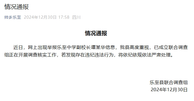 中新网12月30日电 中共乐至县委宣传部官方微信公众号“帅乡乐至”30日发布情况通报称,近日,网上出现举报四川资阳乐至中学副校长谭某华信息,乐至县高度重视,已成立联合调查组正在开展调查核实工作,若发现存在违纪违法行为,将依纪依规依法严肃处理。