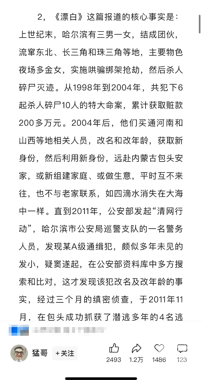 王猛在文中提到,当年自己撰写的这篇报道,是媒体首次完完整整揭示出案件背后的真相和细节“杨树彬团伙911杀人碎尸案”的始末。