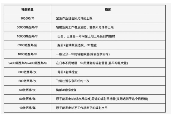 当短时辐射量低于100毫西弗时,对人体没有危害;短时辐射量在100到500毫西弗时,末梢血管淋巴球减少;短时辐射量在500到1000毫西弗时,恶心呕吐,白血球减少;短时辐射量在2000到4000毫西弗时,产生射线疾病,如骨髓和骨密度遭到破坏,红细胞和白细胞数量极度减少,有内出血、呕吐、腹泻等症状;短时辐射量大于4000毫西弗时,危及生命。