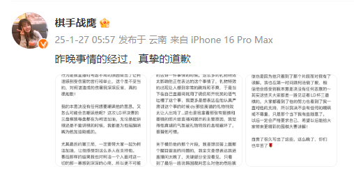 1月27日早,#战鹰发文向柯洁道歉#冲上微博热搜,引发网友关注。
