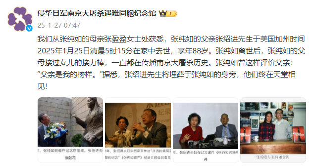 我们从张纯如的母亲张盈盈女士处获悉,张纯如的父亲张绍进先生于美国加州时间2025年1月25日清晨5时15分在家中去世,享年88岁。张纯如离世后,张纯如的父母接过女儿的接力棒,一直都在传播南京大屠杀历史。张纯如曾这样评价父亲:“父亲是我的榜样。”据悉,张绍进先生将埋葬于张纯如的身旁,他们终在天堂相见!