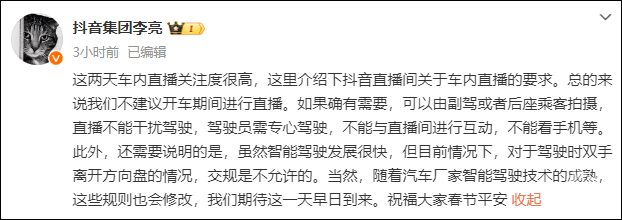 对此,抖音集团副总裁李亮在微博回应称,抖音平台不建议在开车期间进行直播。如果确有需要,可由副驾驶或后座乘客拍摄,直播不能干扰驾驶,驾驶员需专心驾驶,不能与直播间进行互动,不能看手机等。李亮表示,尽管智能驾驶技术发展迅速,但仍需要根据交通法规安全驾驶。